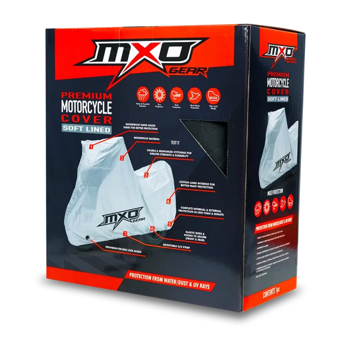 Keep your bike protected from the elements with the MXO Waterproof Bike Cover, designed with fully taped seams for superior waterproofing. Constructed from durable, waterproof material with double-reinforced stitching for long-lasting performance. The soft cotton-lined interior guards your paintwork against scratches, while elasticated ends, secure front/rear hooks, and an adjustable quick-release strap ensure a snug, secure fit. Features a dedicated disc lock access point for added convenience. Offers complete internal and external protection in under a minute—ideal for everyday use or long-term storage.